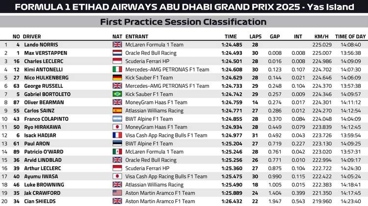 Avec un tour en 1:24.485, Lando Norris place sa McLaren au sommet de la feuille des temps. Le Britannique commence parfaitement son week-end décisif, même si sa marge est infime :