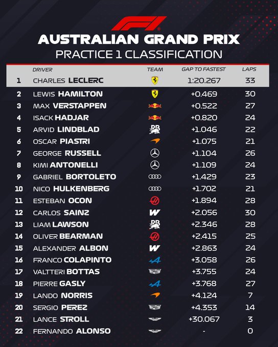 Si Ferrari frappe fort dès la première séance, il est encore trop tôt pour tirer des conclusions définitives. Les programmes différents entre équipes et les ajustements liés aux nouvelles monoplaces devraient encore faire évoluer la hiérarchie lors des prochaines sessions du week-end.