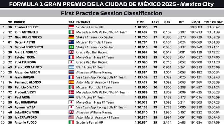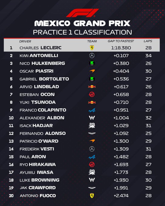 Avec un tour parfaitement exécuté, Charles Leclerc a placé sa Ferrari en tête du classement, prouvant que la Scuderia dispose d’une monoplace bien adaptée à l’altitude mexicaine. Calme et précis, il a dominé une séance globalement calme mais très animée du côté des garages.