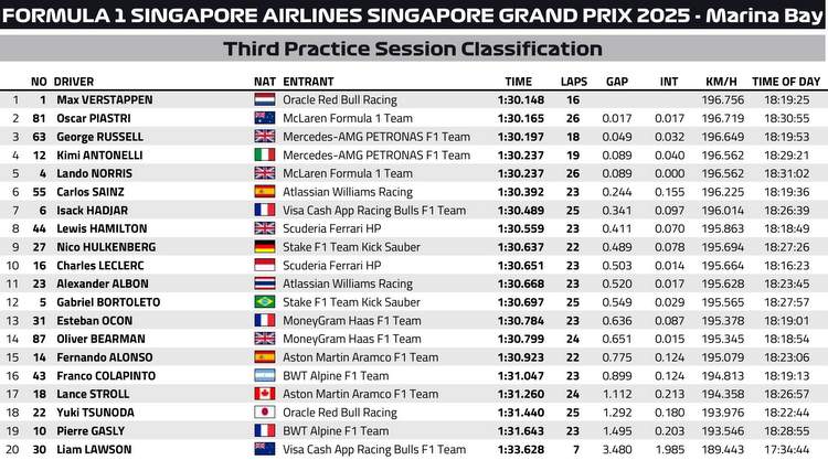 La dernière séance libre avant les qualifications à Marina Bay a vu Max Verstappen s’imposer d’un souffle devant Oscar Piastri, tandis que George Russell revient avec force après une sortie de piste la veille.