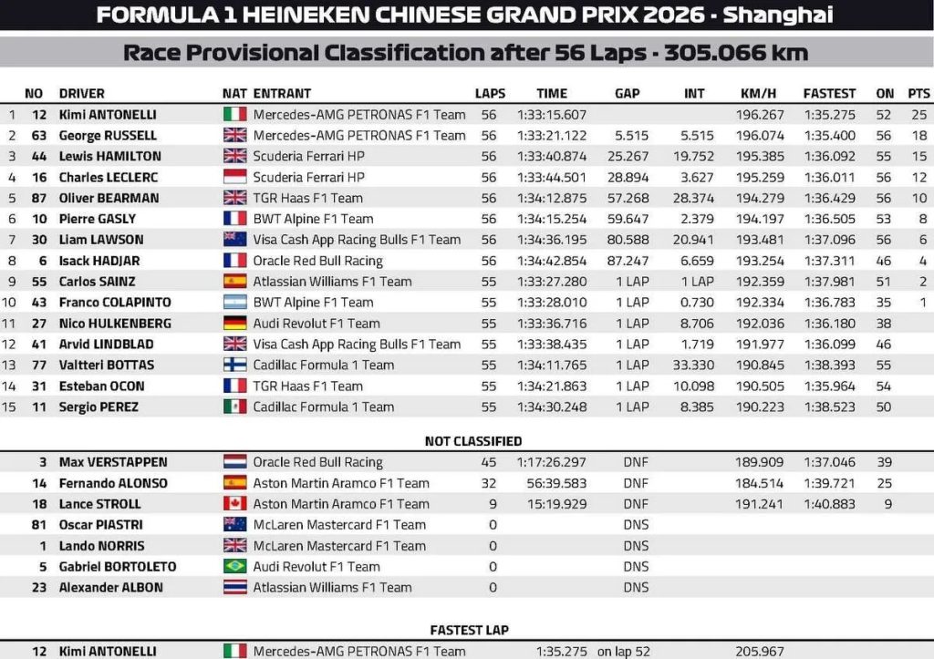 Parti depuis la pole position obtenue samedi, Antonelli a confirmé tout le potentiel aperçu depuis le début du week-end. Il s’agit de sa première victoire en Formule 1, un succès d’autant plus marquant qu’il intervient seulement lors de la deuxième manche de la saison 2026. Russell termine à 5.515 secondes, alors que Hamilton prend la troisième place à 25.267 secondes du vainqueur.