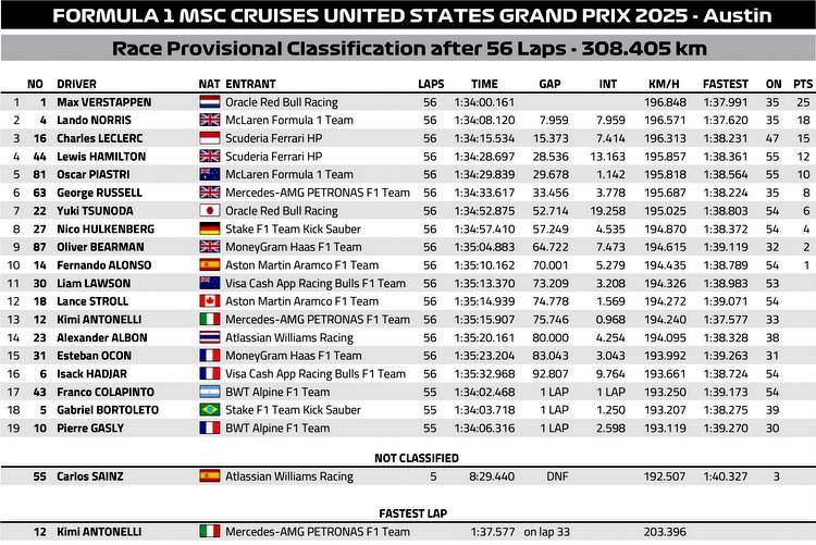 Grand Prix des États-Unis 2025 – Austin : Verstappen impérial, Norris et Leclerc sur le podium