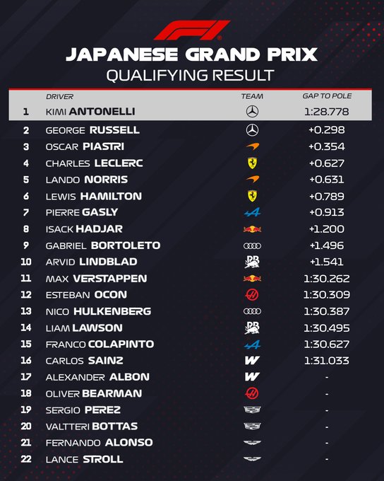 Avant la course, cette qualification envoie un signal fort. Mercedes arrive avec le plein de confiance, Antonelli confirmant une nouvelle fois son excellent début de saison. À Suzuka, la marque allemande partira avec un avantage stratégique majeur, mais McLaren et Ferrari restent suffisamment proches pour espérer jouer un rôle important dimanche.